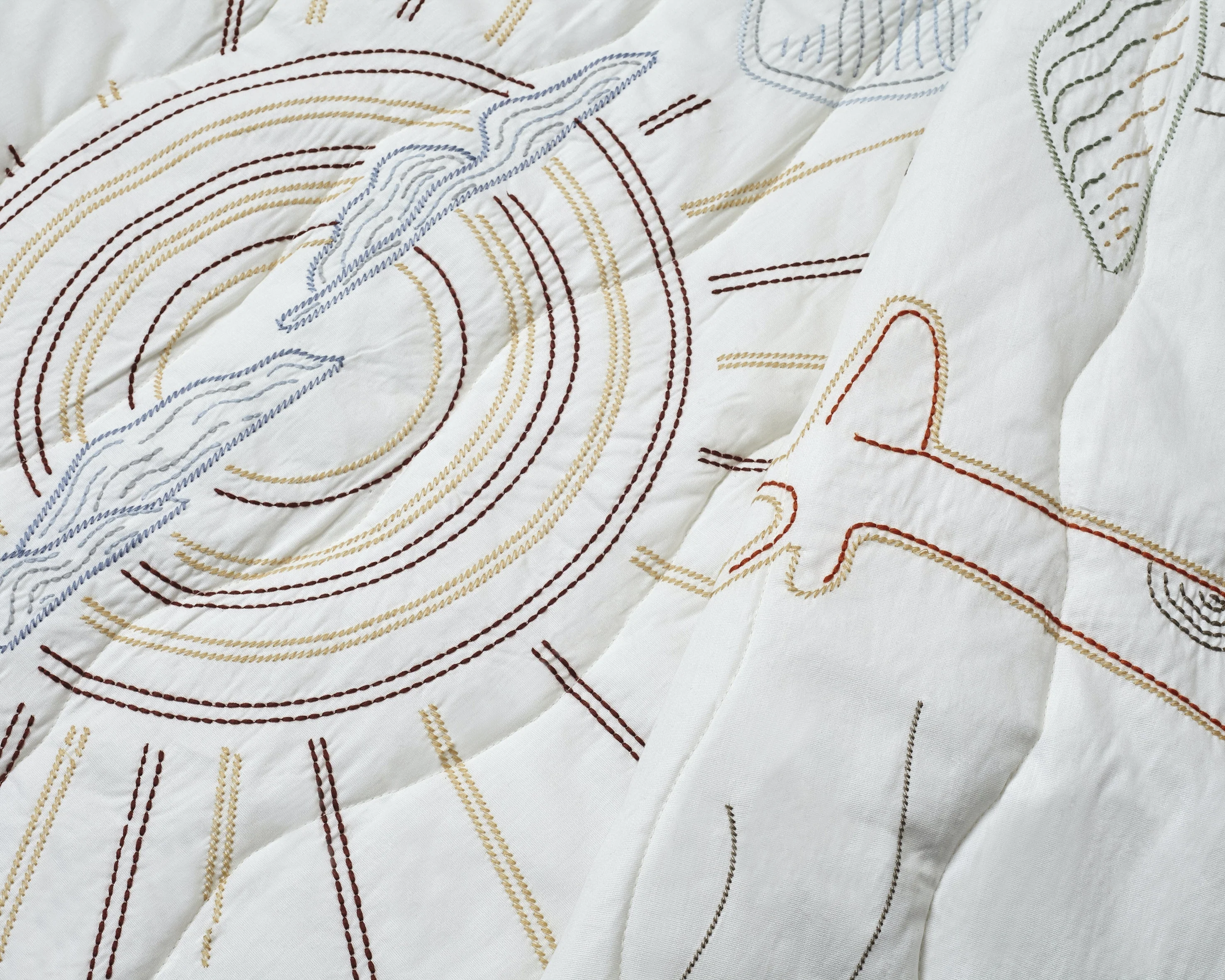 The Safari quilt features embroidered animals roaming an African landscape and is finished with wavy top quilting.