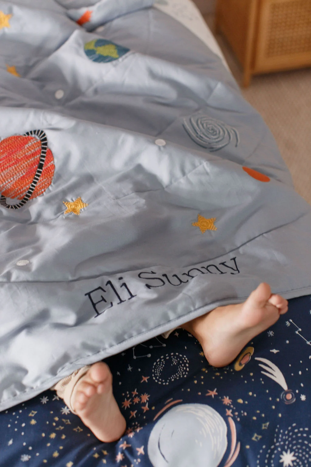 Planets, stars and an astronaut float by on our Starship quilt, featuring an embroidered solar system with orbit top quilting.